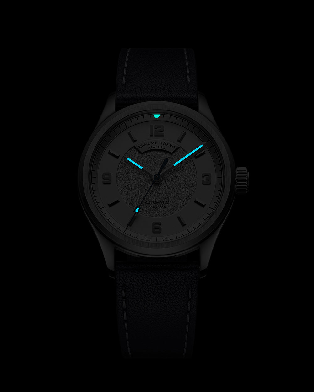 The seconds hand is heat-blued, allowing a deep blue tone to settle gently against the calm silver background—an understated yet striking accent. The tip of the seconds hand, which carries luminous material, is shaped after the great roof of Asakusa’s Kaminarimon gate, a symbolic tribute to the brand’s birthplace. The slim baton hour and minute hands are filled with luminous material that emits a vivid blue glow in darkness, as does the inverted-triangle marker at 12 o’clock, ensuring clear orientation even in low-light conditions.