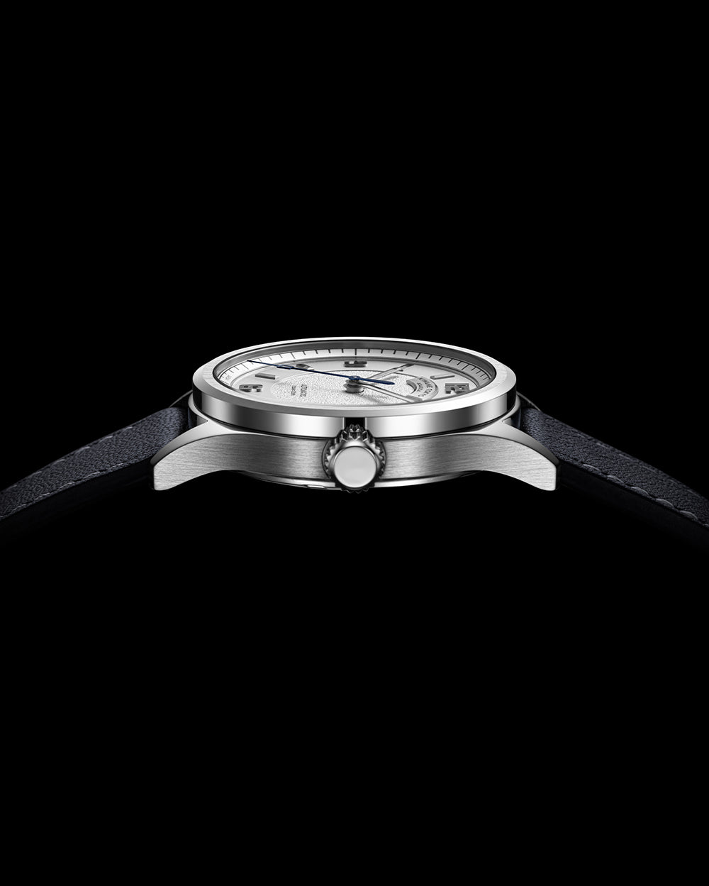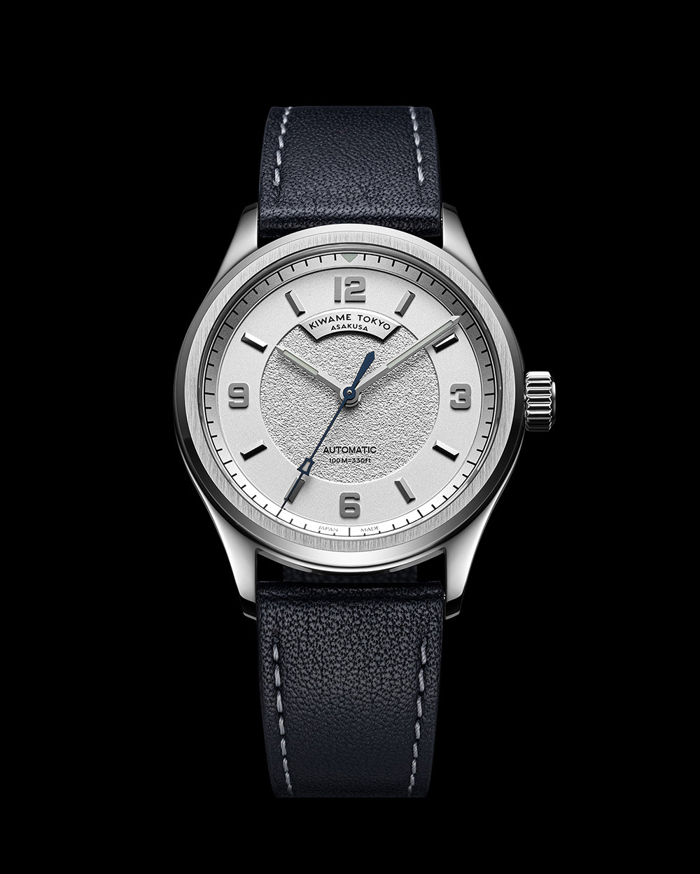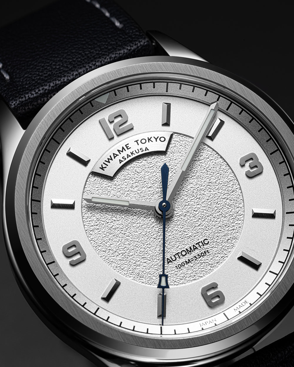 The seconds hand is heat-blued, allowing a deep blue tone to settle gently against the calm silver background—an understated yet striking accent. The tip of the seconds hand, which carries luminous material, is shaped after the great roof of Asakusa’s Kaminarimon gate, a symbolic tribute to the brand’s birthplace. The slim baton hour and minute hands are filled with luminous material that emits a vivid blue glow in darkness, as does the inverted-triangle marker at 12 o’clock, ensuring clear orientation even in low-light conditions.